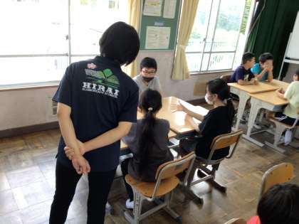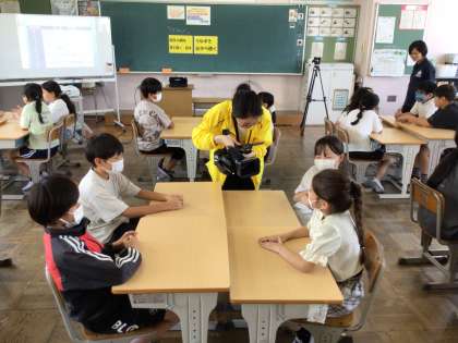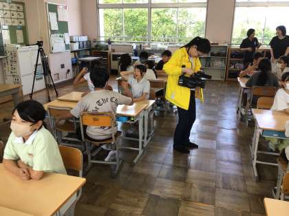 「えがおタイム」の様子を撮影していただきました。カメラは入っていますが、いつものように班で笑顔で聴き合う姿が見られました。