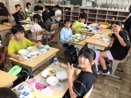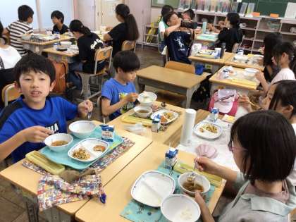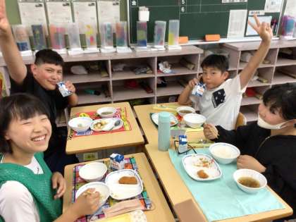 今日の給食はゴーヤチャンプルーやもずくスープ、沖縄メニューでした。どのクラスも楽しく会食をしていました。