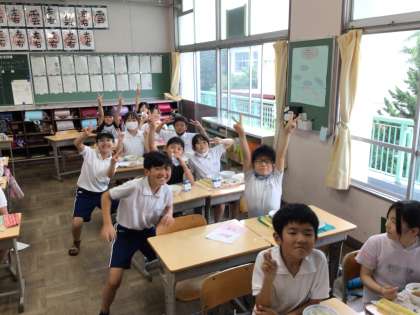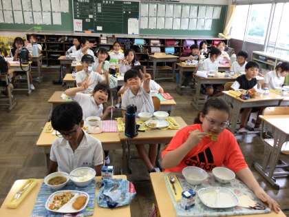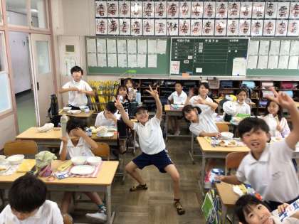 7/9 楽しい給食2 公開日 2024/07/09 更新日 2024/07/09 各学年から 今日も楽しく会食をしています。ピースして今日も大盛り上がりでした。 昨日あたりと比べると気温が高くありませんが、蒸し暑さがあります。下校後も水分補給に気をつけて過ごしましょう。また、夏風邪も流行ってきています。うがいや手洗いをしっかりするようにしましょう。