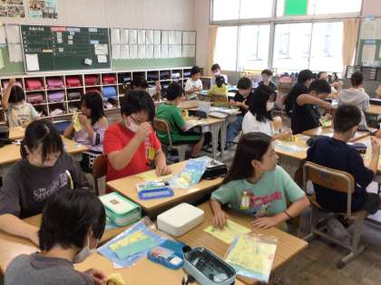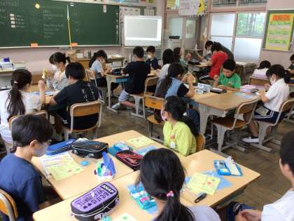 今日の5年生の家庭科では、ボタン付けをしました。二本どりにして、丈夫にボタンが付くようにしました。家でも、自分でボタンを付けることができるようなるといいですね。