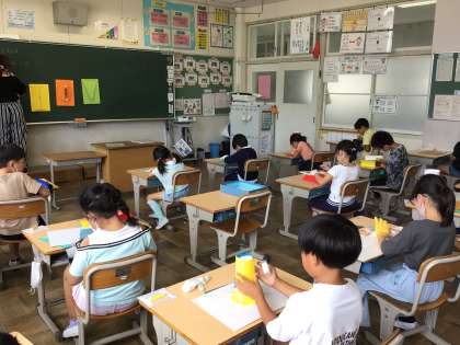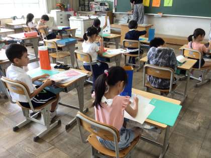 2年生図工では、昨日からカッターを使って「まどからこんにちは」の学習をしています。カッターの使い方を学習してから、厚紙を切ってすてきな窓を作りました。