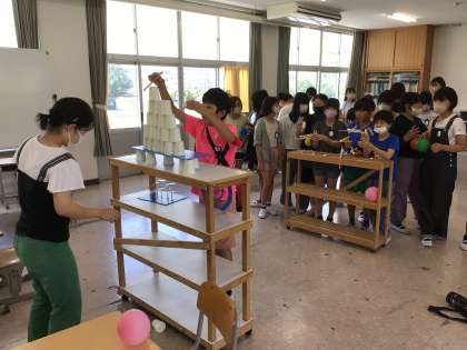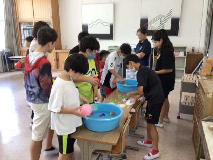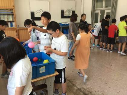 夏休み前に、6年2組では、夏祭りお楽しみ会を計画し、7、8組のみんなを招待してみんなで楽しみました。まとあてや、釣りゲームなど楽しい時間になりました。