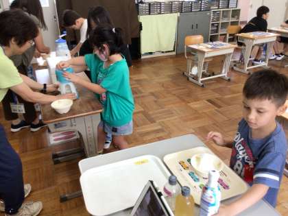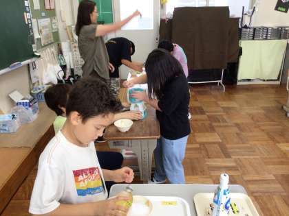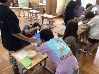 7/19 7、8組「かき氷パーティ」1 公開日 2024/07/19 更新日 2024/07/19 各学年から 7、8組では、「かき氷パーティ」をしました。氷を自分たちで削って、カルピスや梅ジュースを氷にかけて食べました。「冷たくて、美味しいね!」と言いながらみんなで食べました。