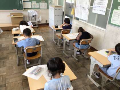 3年算数では、「1万をこえる数」の単元のテストを実施していました。集中して取り組んでいました。1限の全校集会でもあったように、毎日コツコツと復習をしておくと9月によいスタートがきれると思います。