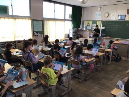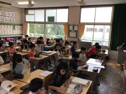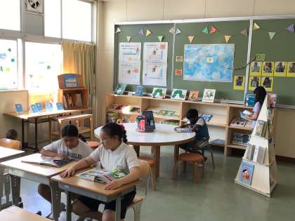 時間より早めに着席しています。落ち着いた雰囲気がよいですね。国際の教室で読書をしている子たちもいます。