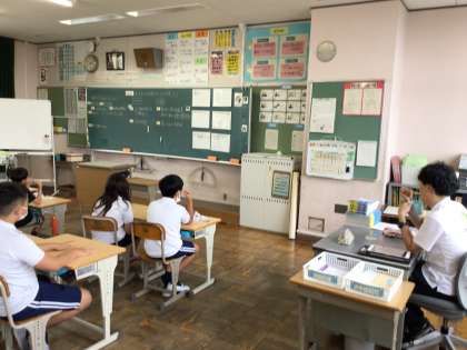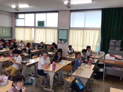 給食の片付けが終わると歯みがきです。今日もリズミカルな曲に合わせて歯みがきをしていました。夏休み中もしっかり歯みがきできていたかな?