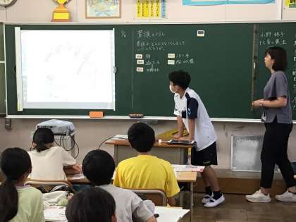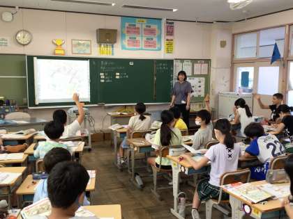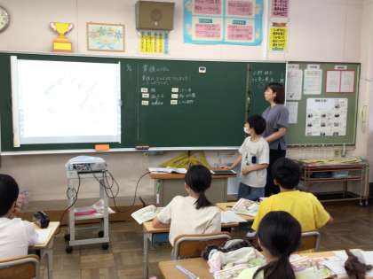 6年社会では、貴族の暮らしについて教科書の資料から気づいたことをどんどん発表していき、平安時代以前の暮らしと何が違うのか考えていました。黒板に映し出した資料を指しながら積極的に発表する姿が良かったですね。