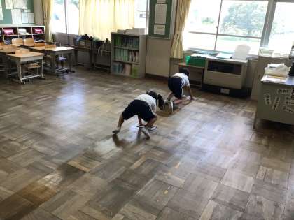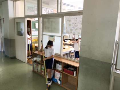 13時20分から15分間は清掃です。分担された場所に移動して清掃を始めます。協力しながら掃除ができたかな?