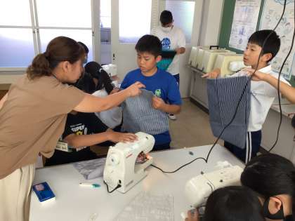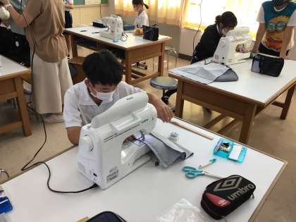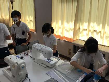 6年家庭科では、被服室でミシンを使ってトートバッグ作りをしていました。「先生、これでいいの?」「うまくできた」など声が飛び交いながらも、一生懸命作業を進めていました。