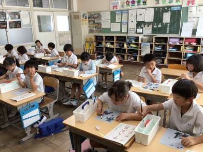 2年生書写では、「はらい」のほうこうに気をつけて書いています。今日は、水ふでで左はらいや、右はらいに気をつけて書きました。