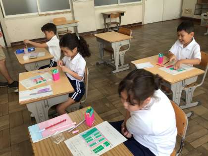 たし算では繰り上がりに気をつけた子どもたちでしたが、ひき算では繰り下がりを気をつけたいと振り返りで書く子が多かったです。数え棒を並べながら、繰り下がりの意味を考えることができました。