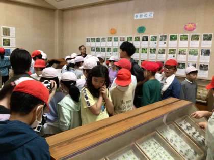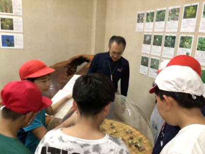 9/11 5年生キャンプ 山の資料館見学 公開日 2024/09/11 更新日 2024/09/11 各学年から 六所山も気温が上がり、暑さが増して来ました。オリエンテーリングの予定でしたが、熱中症指数が高いため、予定を変更し、森の資料館の見学を行いました。普段見られない生き物の様子や六所山の自然の様子を詳しく説明していただき、子どもたちも興味深そうに見学していました。