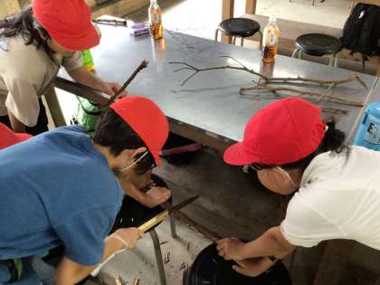 9/11 5年生キャンプ 木の枝スプーン作り1 公開日 2024/09/11 更新日 2024/09/11 各学年から 自分が好きな木の枝を見つけ、それを使ってスプーンを作ります。スプーンにちょうどいい長さになるようにノコギリで切ります。