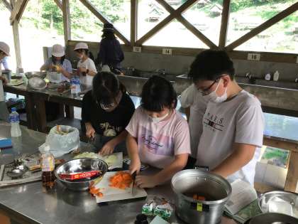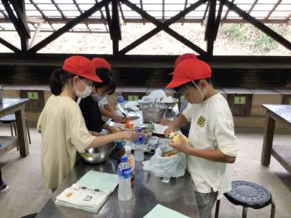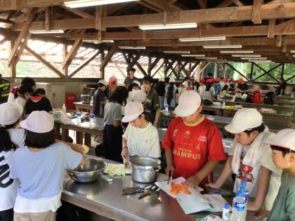 9/11 5年生キャンプ 野外炊事1 公開日 2024/09/11 更新日 2024/09/11 各学年から いよいよカレー作りです。お米の担当、カレーの担当に分かれて仕事をします。「もう少し小さく切った方がいいよ」「私、水入れてくるね」「片づけながらやろう」などと声をかけ合いながら、協力して手際よくカレーライスの準備を進めていました。