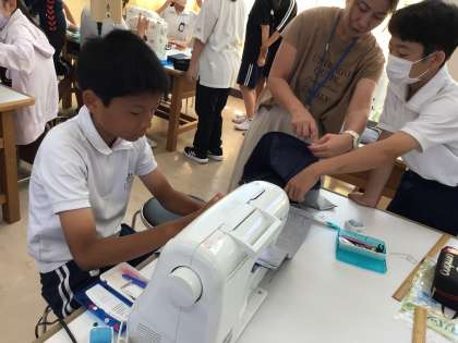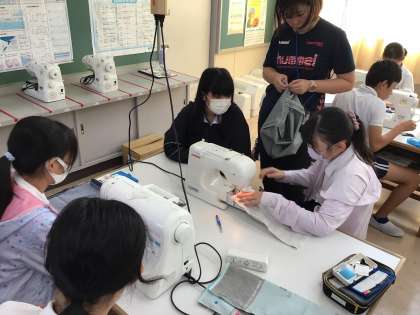 6年家庭科では、前回の続きで被服室でトートバッグ作りを行っていました。ミシンを使って慎重に縫っていました。