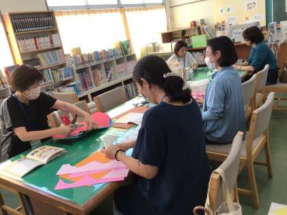 毎週火曜日は、図書館ボランティアさんが季節の飾りを掲示したり、図書館の環境整備をしたりしてくれています。なごやかな雰囲気だからこそ、楽しい飾りが作れるんだと感じました。