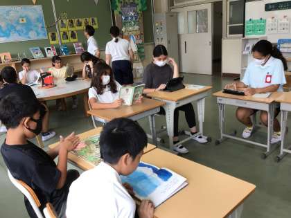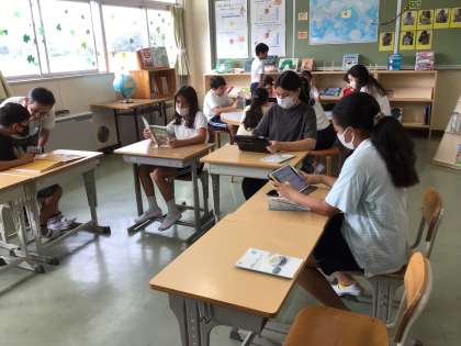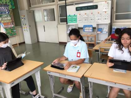 国際の子供たちが国語の力を身に付けるために、国際の教室では読書プログラムがスタートしています。56年生を中心に0のレベルから順番に本を読んで、タブレットにあらすじや感想をまとめていくものです。すでに3冊の本を読み終わった子もいます。6年生が卒業までに全部読むことができるといいです。