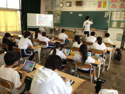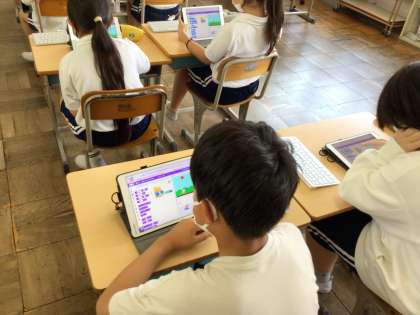 コンピュータクラブは先生の説明を聞きながら、プログラミングに挑戦していました。