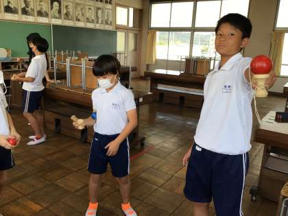 昔遊びクラブはけん玉を体験していました。なかなか思うようにできずに苦労していました。