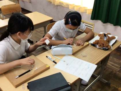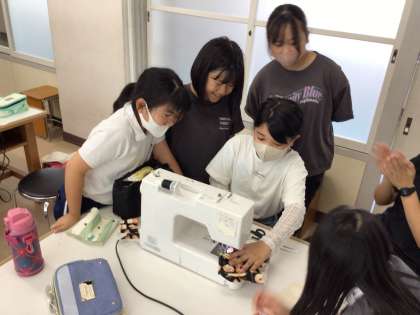 裁縫クラブでは、被服室でミシンを使って作品作りに励んでいました。