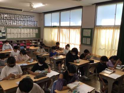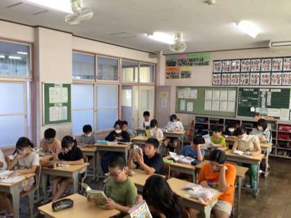 時計を見て静かに読書が始まっています。姿勢よく読書ができているのも素晴らしいと思います。よい習慣は続けていきましょう。