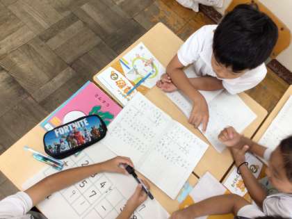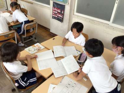 2年算数では、筆算を使った計算方法について、班で話し合いながら解いていました。今まで習ったことを頼りに、方法を考え教え合っていました。