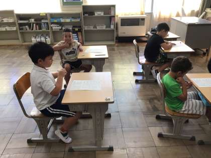1年生国語では、1から10までの数字を、漢字で書いたり、読み方を学習したりしています。漢字テストをして、間違えた問題は繰り返し練習しています。国際学級でも同じように漢字を練習しました。
