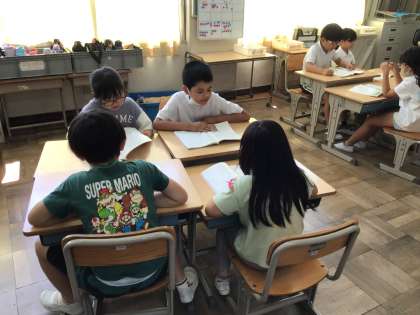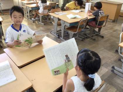 2年生の国語「ニャーゴ」の学習では、グループごとに音読の練習をしています。音読発表会にむけて役割を決め練習しました。