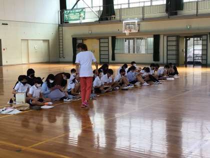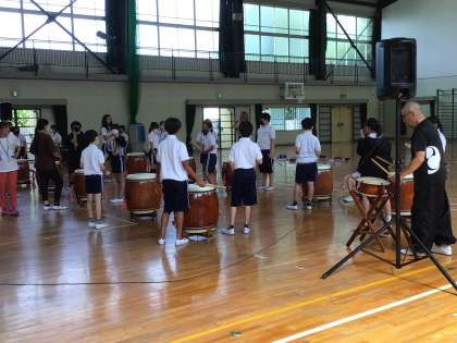 9/25 和太鼓体験3 公開日 2024/09/25 更新日 2024/09/25 各学年から 3時間目は、6年1組が和太鼓体験を行いました。6年生は昨年度も体験しているので、練習してすぐにグループで発表をすることができました。