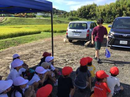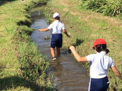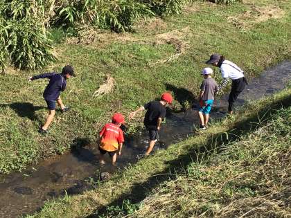 網の使い方の説明も聞きました。土手を降りて川のところに行くと涼しい風が吹いていました。どんな生物を見つけることができるかな?