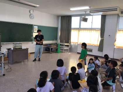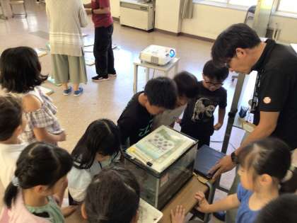 9/26 2年岩本川探検6 公開日 2024/09/26 更新日 2024/09/26 各学年から 学校に戻って着替えをした後、多目的室で岩本川研究所の方の話を聞きました。岩本川に生息している生き物の種類や特徴についての説明を聞いた後、水槽の生物の観察もしました。