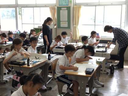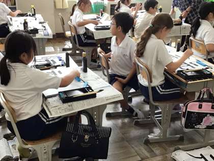 3年生の書写では、書写ボランティアの方に来ていただき、筆の使い方を教えていただいています。3年生で初めて毛筆になり、半年間練習してきて、だいぶ上手に書くことができるようになってきました。