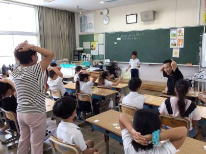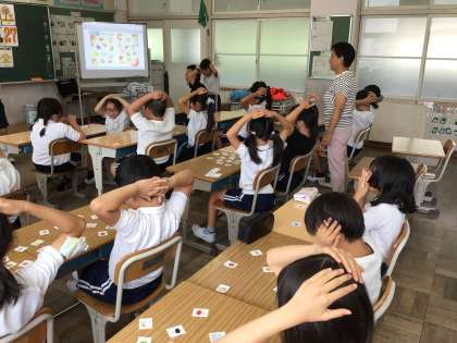 9/27 3年生外国語活動 公開日 2024/09/27 更新日 2024/09/27 各学年から 3年生の外国語活動では、自分の好きなものを発表し、その絵カードを取るゲームをしました。頭の上に手を組んでスタートし、言われた英語の単語を聞いてカードを取りました。