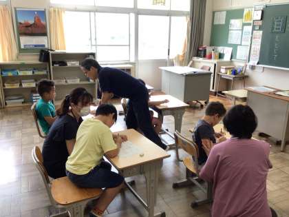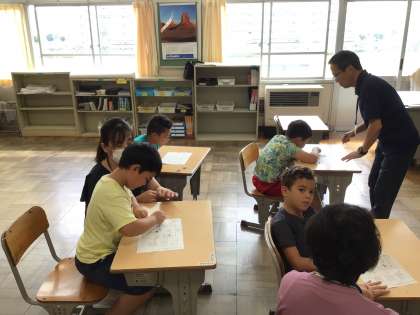1年生の国語、国際学級では、漢字を一画一画丁寧に書いたり、漢字の読み方を学習したりしています。