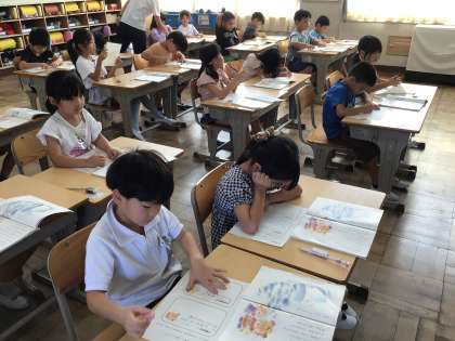 1年生の国語では「かいがら」の学習をしています。今日は、1組も2組も「くまの子とうさぎの子」に手紙を書きました。