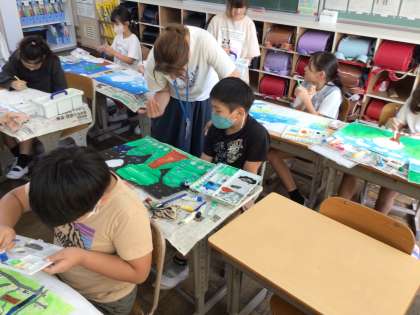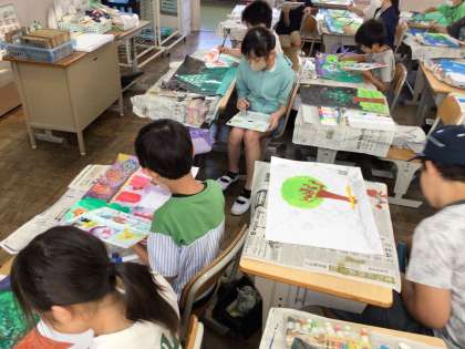 9/30 4年図工 公開日 2024/09/30 更新日 2024/09/30 各学年から 4年図工では、読書感想画の下書きが終わり、本格的に絵の具で色を塗っていました。木の葉っぱの部分の塗り方を工夫したり、空の色を悩みながら塗ったりするなど、先生の説明やアドバイズをもとに作業を進めていました。