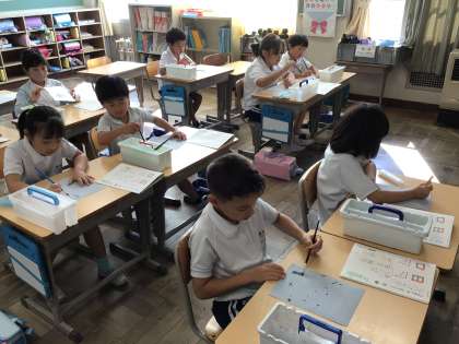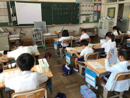 今日の2年生書写では、「おれ」「そり」に気をつけて書くことをめあてに学習しました。水筆を使ってみんな集中して書く姿が見られました。