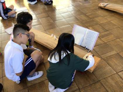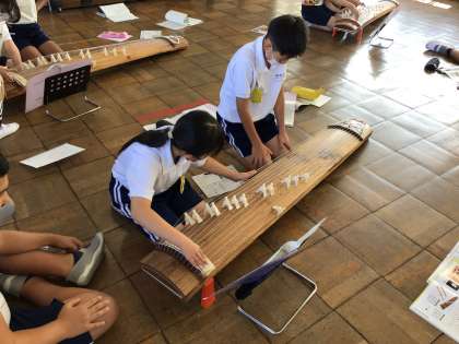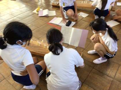 10/2 和楽器体験2 公開日 2024/10/02 更新日 2024/10/02 各学年から 琴の前に正座をして練習をしています。楽譜を見ながら演奏をするのですが、なかなかうまくいかず、苦戦していました。
