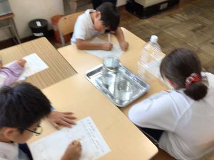 10/9 2年算数 公開日 2024/10/09 更新日 2024/10/09 各学年から 2年算数では、「1Lより少ないかさのたんいを覚えよう」というめあてで学習を進めていました。実際に水を入れて1Lをはかりとり、手で持ってみて1Lの重みも実感していました。班で協力しながら1Lより少ないかさの単位dLを学習しました。
