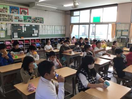10/10 フッ化物洗口 公開日 2024/10/10 更新日 2024/10/10 各学年から 毎週木曜日の朝はフッ化物洗口です。リズミカルな曲に合わせてブクブク洗口をします。読書中に担任が準備をしてスムーズに実施ができるように工夫をしています。