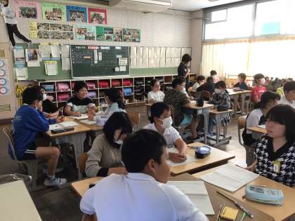 今日の5年生算数では、「二つの約数を同時に求める方法」について考えました。グループで考えたり、みんなの前で発表したりしました。
