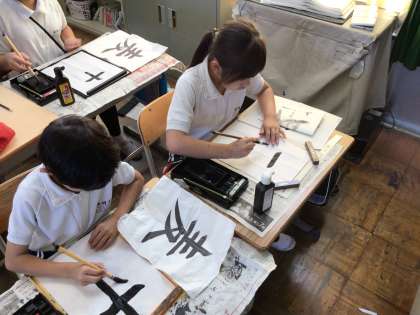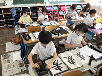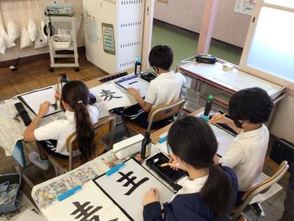 4年1組の書写では、「麦」の清書を行いました。はらい、字のバランスなど今まで練習をしてきたポイントを再度おさらいをしてから清書に入りました。集中して作品を書き上げていました。