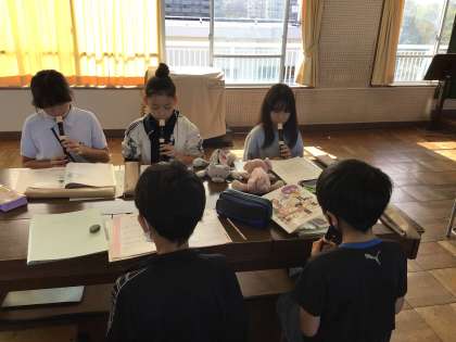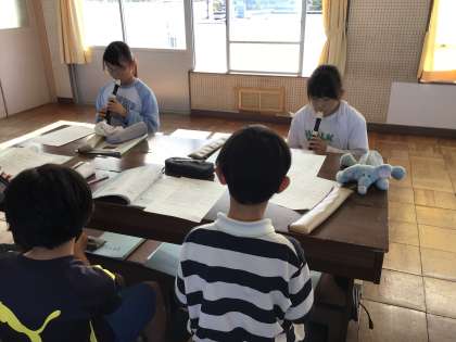 10/10 4年音楽 公開日 2024/10/11 更新日 2024/10/11 各学年から 4年音楽では、「いいこと ありそう」「まきばの朝」を元気よく歌うことができました。リズム練習の後、「陽気な船長」(リコーダー)のグループ練習を行いました。互いの音を聴き合って演奏することを意識して練習しました。