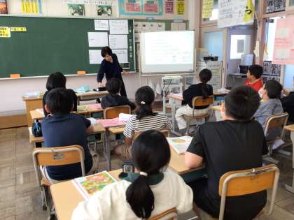 5年家庭科では、「買い物の手順を知ろう」というめあてで学習を進めていました。タブレットで資料を映し出された資料を見ながら真剣に先生の説明を聞いていました。頷くなど話を聴く姿勢がよいので素晴らしいですね。