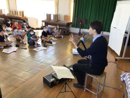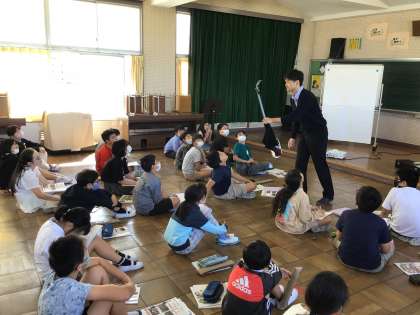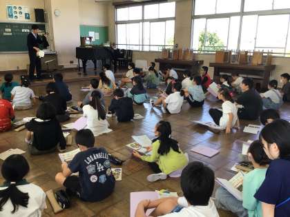 5年音楽では、「三味線の音色を聴こう」というめあてで学習を進めていました。本校職員が講師として、三味線の楽器紹介や特徴を説明した後、「本調子 三絃二重奏」を演奏していただきました。