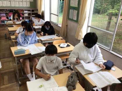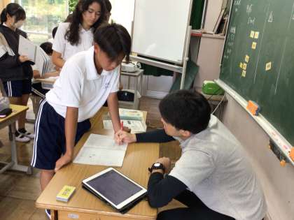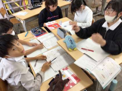 10/16 6年算数1 公開日 2024/10/16 更新日 2024/10/16 各学年から 6年算数では、少人数で3グループに分かれて学習を進めていました。比とその利用のところを学習していて、3グループとも問題演習の時間でした。先生に質問したり、友達と教えあったりしながら問題に取り組んでいました。