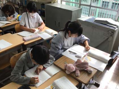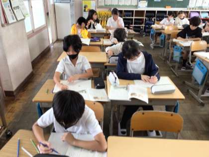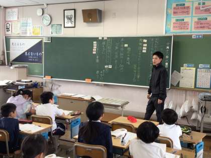 4年国語では、「一つの花」という物語について学習を進めています。戦時中の物語なので、先生が時代背景について補足説明をしながら、今日は第3場面の読み取りをしていました。