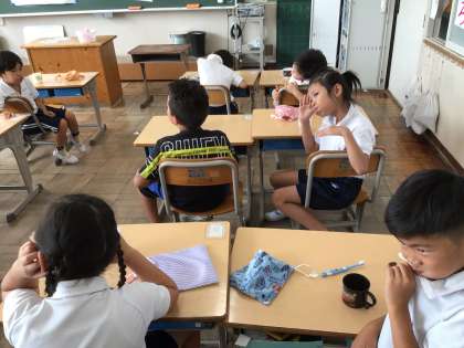 木曜日の朝は、フッ素洗口があります。音楽に合わせて、口の中を濯ぎます。虫歯予防に努めましょう。