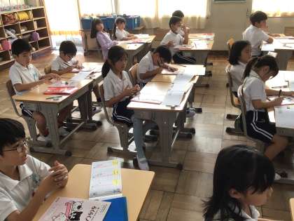 今日の1年生の国語では、漢字の学習をしました。漢字ノートを初めて使い、漢字の「一」「ニ」など丁寧に書く姿が見られました。