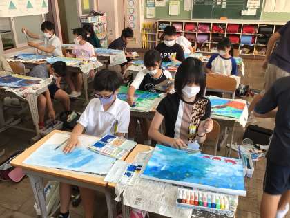 「やまなし」というお話の読書感想画を描いています。絵の具の筆だけでなく、指やつまようじを使って塗ったり、スパッタリングを使ったり、お話の雰囲気を出すために工夫しながら作品を仕上げていました。